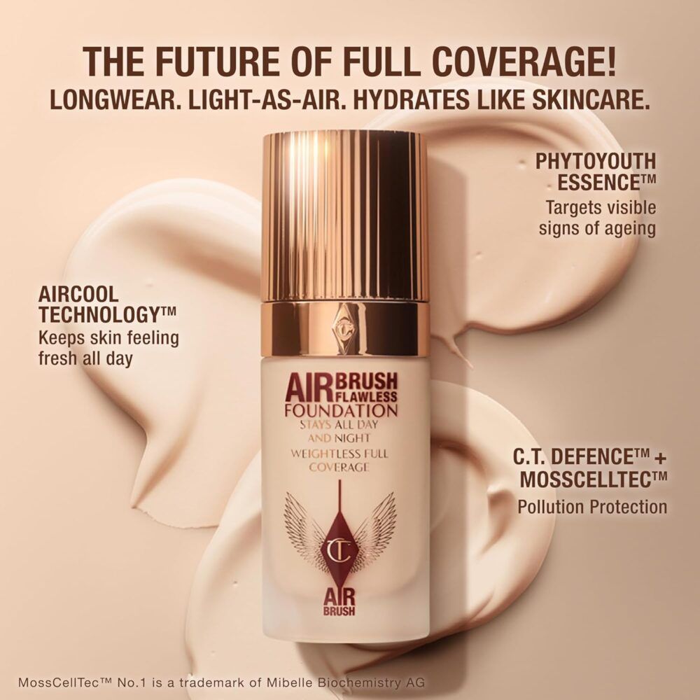 Charlotte Tilbury Airbrush Flawless Matte Foundation – Full Coverage Liquid Makeup with a Natural-Matte Finish – Smoothes & Blurs Pores – Waterproof & Transfer Resistant A skincare‑infused, long‑wear foundation with full, poreless coverage. Powered by 2% REPLEXIUM™ anti‑aging peptide and MossCellTec™ hydration boost. Sweat‑, humidity‑ and transfer‑resistant for a fresh, matte finish. This weightless, full coverage foundation blurs pores, reduces fine lines, and delivers a flawless matte look. Apply foundation to the Hollywood Complexion Brush or damp sponge in light strokes outward from center.