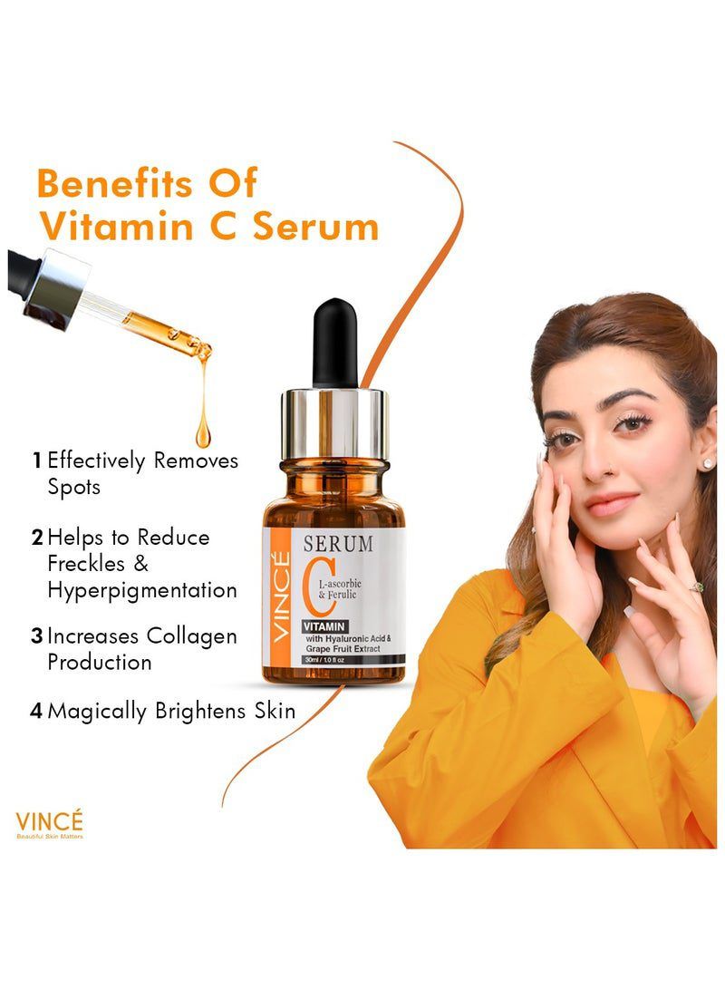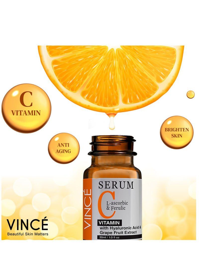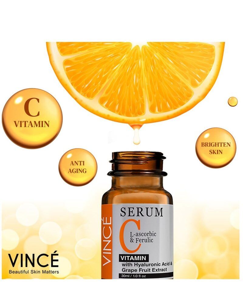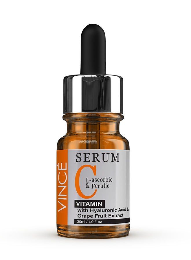 A super stable formula enriched with skin brightening L ascorbic, ferulic acids, and Hyaluronic acid also a soothing botanical blend of grapefruit extract that helps to brighten up the complexion. The lightweight texture instantly absorbs with a non-greasy feel, helps fade dark spots, firm skin, and improves skin texture, it also promotes an even tone and gives skin a smooth, renewed appearance. Effectively reduces the appearance of dark spots, hyperpigmentation, and sun damage, giving your skin a clearer and more even-toned look. Enhances your skin’s natural radiance, leaving it visibly brighter, refreshed, and glowing with a healthy appearance. Targets uneven skin tone and discoloration, giving you a smooth, balanced, and radiant complexion. Boosts natural collagen production to improve skin elasticity, making it firmer, plumper, and more youthful. Deeply moisturizes and soothes the skin, improving texture and providing a renewed appearance. Absorbs quickly into the skin without leaving any greasy residue, making it perfect for daily use and suitable for all skin types. Skincare Benefits: Moisturizes, Soothes, Brightens, Reduces Dark Spots, and Evens Skin Tone & Texture. For skin concerns: Dark spots, hyperpigmentation, discoloration, dullness, sun damage, and uneven skin.